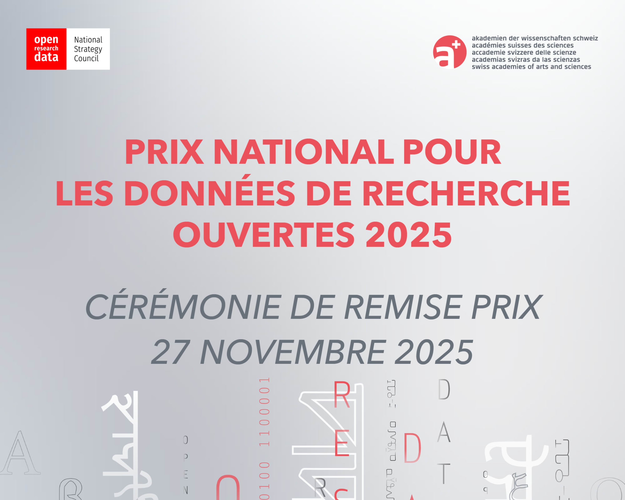 Le 27 novembre 2025, les Académies suisses des sciences décerneront le Prix national pour les données de recherche ouvertes (Prix ORD). Ce prix s'inscrit dans le cadre du plan d'action « Open Research Data » mis en œuvre par les académies dans le cadre de la stratégie nationale pour les données de recherche ouvertes. Il vise à récompenser les chercheurs pour leurs pratiques innovantes dans le domaine des données de recherche ouvertes (ORD) et a pour objectif de promouvoir la transition vers des pratiques de recherche ouvertes. Inscrivez-vous à la cérémonie de remise des prix et venez célébrer avec nous les projets innovants des lauréats.